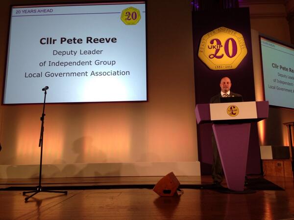 Of course if Independent Councillors and Police and Crime Commissioners are to be taken seriously, they need to be clearly distinguishable from their party based colleagues. One of the places where this is not happening is the ‘trade union’ of Councillors, the Local Government Association (LGA). As the photograph above shows, taken at the recent UKIP conference, the deputy leader of the Independent Group of the LGA is a chap called Peter Reeves, who is a UKIP Councillor. Peter like his colleagues at UKIP is a member of the Independent group of the LGA as are Green, SNP, BNP and Plaid Cymru Councillors. As someone who stood as an Independent candidate at the PCC elections, I know there is a fundamental difference between someone who is a member of a small party and someone who believes that our political system needs Councillors, MPs, PCCs and even MEPs who represent their electors without any organisational compromise. It is clear that the Political Parties provide a great deal of value and identity to their members. However this strength is matched by a counterbalance which is the need on occasions to dance to a tune set by the party members. This in effect means that 1% of the electorate (those who are members of political parties) have a disproportionate level of influence on the majority of our political structures. I believe this is not sustainable and that the PCC elections pointed towards an appetite for change. I understand that 12 Independent PCCs and 147 Independent Councillors do not make a Summer, but think it is time that organisations such as the LGA begin to clarify the difference between Independents and those who political parties are not yet as large as the so called major parties. One of the valuable functions of political parties is to ensure that the candidates in elections are reputable and have been accepted as suitable by an organisation that has the resources to carry out checks and balances. The Independent Network is able to do this on behalf of those who are not members of political parties. Perhaps our broadcasters could contact this network for future panel members of their political discussions?