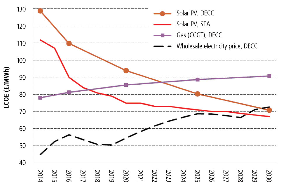 Somewhere in the years between 2017 and 2023 it will become cheaper to produce electricity through solar photovoltaic cells than through the burning of gas. The purple line of the graph shows the projected cost of using gas to produce electricity between now and 2030 and the red and brown lines show the use of PV cells. The distinction between the STA (Solar Trade Association) and DECC (Department of Energy and Climate Change) lines is suggested in this article by the STA as the cost of politics and a stable policy base. It is impossible to know which data is most accurate and we cannot be certain of the future in any event. However attempts by the coalition to row back on planning flexibility regarding PV solar farms is a matter of public record. The STA are claiming that if there was political certainty the cost of producing electricity using solar panels would fall more quickly. We will shortly elect a new Government. Whatever our Political views it seems vital that we elect a Government that is prepared to offer certainty and a clear policy framework for the PV industry, if we are too reduce the impact of fossil fuels on our environmental account. Even if we simply see this in terms of economics, we cannot afford a Government that is not committed to the use of PV solar panels to produce power in a clear and uncomplicated manner.