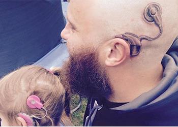 This is a photo of Alistair Campbell and his daughter Charlotte, both from New Zealand. Charlotte has just had a bright pink Cochlear implant fitted and so Alistair decided as a mark of solidarity with his daughter to have his head shaved and the image of a cochlear implant tattooed on his head. Apparently Charlotte giggled and said the tattoo was cool when she first saw it. Although Alistair plans to let his hair grow back for the moment, he will get it shaved again if Charlotte wants to see the tattoo. The story comes from this edition of Hearing Times. Although there is no link, apart from timing, this story emerged in the last few days, and today it is the 80th birthday of Australian Dr Graeme Clark who invented the multi-channel Cochlear implant. Two amazing men from the same Continent!