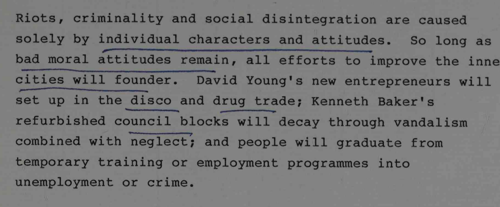 Its baffling, how something written by very highly educated and intelligent men could be presented at the heart of Government and then be so easily dismissed 30 years later. This is particularly odd bearing in mind the current focus on the Magna Carta which is over 900 years old and still holds relevance to our Government and the nation. The latest set of papers released by the National Archives include the images above and have been responded to by Oliver Letwin who was one of the two co-authors of the document. Following his education at Eton he was educated to Phd level at Cambridge. He is currently the Chancellor of the Duchy of Lancaster, serving as a senior Government Minister and despite the many stupid things he has said and done is not a fool. Letwins statement is “I want to make clear that some parts of a private memo I wrote nearly 30 years ago were both badly worded and wrong. I apologise unreservedly for any offence these comments have caused and wish to make clear that none was intended.” The memo might well have been private, but they were nevertheless used to argue, convincingly it seems for brakes to be applied on proposed Government spending to reduce the social issues that the memo refers to. Many people on social media and in the papers argue that this is evidence that Letwin was racist at the time due to the arguments employed in the paper. On the other hand Nicholas Soames has defended his friend on twitter suggesting that he ‘does not have a racist bone in his body’ which is a statement that is just as extreme and ridiculous as some of the accusations are. The truth is that no one knows if this was a document intended to argue what Letwin believed at the time, or simply a piece to argue against the ideas of Ministers in the Thatcher Cabinet. What is clear is that these excerpts do not argue in a coherent manner for an alternative course of action, and in that sense would not pass as degree level thinking let alone doctorate level. Was Letwin suggesting that because there were no riots in the 1930’s and later, that it was perfectly reasonable for slums to exist in the mid 1980’s and beyond. It is clear that Letwin now believes that his document, previously presented to the Prime Minister and her Cabinet was badly worded and wrong. It seems clear that at the very least he needs to better explain what he was doing presenting a poor piece to the Cabinet and what he really meant to express at the time. Perhaps just as importantly, bearing in mind that his paper (or other views, not yet revealed) did slow the investment in improved social housing and employment schemes, how much he regrets the policy adopted by the Thatcher Government of the time. This would allow us to move from accusations of racist thinking (or not) to the existing ills of poor housing schemes and employment schemes.