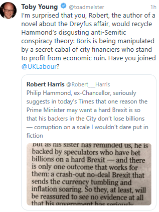 The memoir written by Toby Young in 2011, How to Lose Friends and Alienate People appears to be reappearing in this tweet a couple of days ago which has claimed that when Philip Hammond attacked the Boris Brexit backers in the City of London that Philip was being Anti-Semitic. Now since this tweet appeared a number of people have pointed out that a wide range of the very wealthy people who have been trying to force us to leave on a certain date without a deal or with a very dangerous deal, are certainly not Jewish. Indeed it appears that Toby has now apologised because understandably Philip threatened to take Toby to Court for making such an offensive claim. However there is a clear challenge for all of us who wish to remain in the EU and are prepared to call for a more credible approach by our Government which is currently in such an appalling state with Johnson claiming that a hard border in the Northern Ireland, a few miles from the border will be acceptable. What we need is the ability to hold conversations and indeed to make statements but not to make threats on one another. It is clear that Anti-Semitism in its reality is a Hate Crime and it requires all of us to be very quick to challenge it. However every time someone with a high-ish profile and who works as an associate editor of a high profile magazine like the Spectator claims there has been Anti-Semitism, simply to try to offend someone who is not being Anti-Semitic, the prospect of the Anti-Semitism being heavily diluted is increased. The apology from Young to Hammond needs to be extended to the Jewish community and he needs to be a great deal more careful in his tweets in the future.