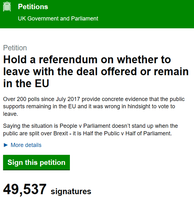 As we approach a key milestone in Robert McMaster’s petition, it seems worthwhile reminding our MPs that in another few days there will be 100,000 signatures in his call to “Hold a referendum on whether to leave with the deal offered or remain in the EU”. I signed it at the beginning of the week when it had just passed the 10,000 mark and I have written this when it is approaching the 50,000 mark. The next stage is 100,000 when MPs meeting on Monday will have the opportunity to call for a debate on this subject and it seems perfectly reasonable to ask for that to take place given that the incompetent and deceitful Prime Minister wants a debate on whether to have a second General Election since we had the referendum!