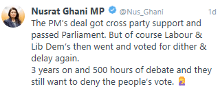 Sadly most Sussex MPs voted in favour of the second reading apart from the three Brighton and Hove MPs and they along with Stephen Lloyd voted for what Nusrat referred to as the dither and delay. Yet when it came to the five hour debate, only Caroline Lucas and Peter Kyle took the trouble to explain their views. Perhaps we could now call upon the 12 MPs who supported the Bill and the idea of a mere two day debate to explain why they believe this is credible? Michael Fabricant MP who was once chair of the Brighton Pavilion Conservative Association did claim that “the Mayor of the West Midlands is in very close contact with manufacturers in the area, including Jaguar Land Rover. They are saying that the most damaging thing to manufacturing and industry as a whole is the uncertainty due to delay. They want the deal done and the deal done now.” It seems strange that within 18 hours of the Bill being published that any business owners would have made such a claim. Our Brighton Pavilion MP, Caroline Lucas stated “As many others have said today, democracy is a process, not a single event. Since that referendum, we have had one general election, two Prime Ministers and a wealth of further information about the costs and complexities of Brexit, and the lies and law breaking that stained that poll on 23 June 2016. The Prime Minister has changed his mind on more occasions than it is possible to count, most recently over the prospect of a border in the Irish Sea. It is wrong that the British people are apparently the only people who will not be allowed to change their minds.”