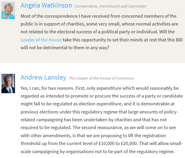 Along with the comments made above by Angela Watkinson from 22nd January 2014, Jacob Rees-Mogg spoke very clearly on the 3rd of September 2013 about the value of the Bill: “Charities are not allowed to campaign in general elections, and quite rightly so. Political parties fight hard to raise their money, whether it comes from unions, business or individuals. Why should they not have charitable status, when charities may intervene in elections using the tax they have reclaimed—the extra funds and the status they have as charities—but without standing for election fully? And they cannot: the law does not allow charities to be directly involved in general elections”
