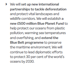 The final sentence refers to the news that apparently we are already leading the world in an attempt to protect 30% of the world oceans by 2030. It is unclear why we have set out to only focus on 30% and indeed what will have happened by 2030. If we are leading the world on such a theme, which other nations are focusing on the other 70% of the worlds oceans and what precisely does protecting the worlds oceans actually mean?