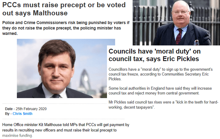 These two images above, both come from two Conservative Government Ministers speaking to the public and to local politicians, both referring to the same local tax arrangements. Back in 2012 Eric Pickles was working very hard to ensure that the local Council tax and the Police precept was frozen, he eventually allowed a 1% increase as an absolute maximum and anything beyond that would require a local referendum! The impact of that meant that all of the Conservative Police and Crime Commissioners promised that they would not increase local police precepts, and indeed many like the Sussex PCC, Katy Bourne claimed that funding did not need to be increased because in her words she was capable of making Sussex Police more efficient. This year Kit Malthouse who is the Minister responsible for Policing in the Government and was previously Boris Johnsons equivalent to the Police and Crime Commissioner for London is saying something very different. And surprise surprise the Conservative PCCs are now all saying the same thing, or rather the opposite thing to what they and their predecessors said 8 years ago. The challenge we have here is that not only has the Conservative Party done a total U turn, but their comments a few weeks ago in the latest party manifesto also appear to have made very different claims to what Malthouse is now saying. The manifesto stated: