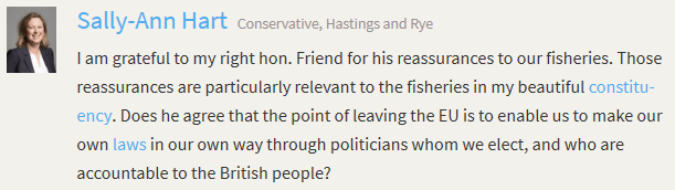 So Sally-Ann Hart who is MP for Hastings is understandably concerned for the future of her constituency and in particular the fishing industry located in the setting. There are of course some real concerns now that the UK Government may well give the fishing industry very little support in its approach to the free trade deals because of the relatively small elements of the economy that it relates to. However whatever happens regarding the fishing industry and indeed our other elements that are currently up for grabs, the truth is that the EU is very democratic. Its Parliament used to have 74 British MEPs and its decision making is all proposed through the leaders of each of the 28 nations including our Prime Minister. Our Government also had the chance to select and even propose the member of the EU Commission. To suggest that our MPs are more in touch than our MEPs is pure nonsense and for a Government of 650 MPs to be better connected to us than 730 odd MEPs is just as incorrect.