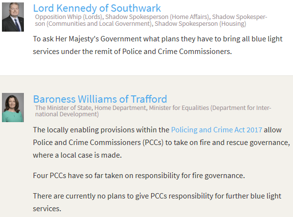 Whatever the motivation of this question that was answered in the House of Lords on 27th February it is very clear to me as someone who took part in the early steps of the Police and Crime Commissioner roles, that they are supposed to deal with what it says on the label. Providing local Governance for Police Services is only supposed to be one part of the PCC but when someone decided to let the PCC’s apply to also offer governance for Fire Services they made a very big mistake. Fire Services are no more related to Crime issues than the local authorities or many local businesses. However the Criminal Justice Service which includes local Courts and local Prisons as well as the Probation Service all require a level of local Governance. By the same token the variety of local charities that set out to help the police to reduce Crime and prevent Crime also need a lot of support from political bodies and the PCC is the obvious way of achieving all of that. Sadly most PCCs would rather do what their political party is telling them as only a very small number of independent PCCs still exist. Let us hope in May’s election that this will be reversed dramatically.