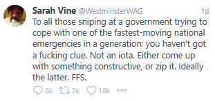 As the Government tries to resolve its decision making, on the one hand we have reflections that in the last 7 weeks the call by the government for the UK to acquire coronavirus ‘herd immunity’ is not working and the last 7 days have demonstrated a major shift from that arrangement since Johnson began the evening presentations. It also appears that comments by Dominic Cummings several weeks ago are now being denied due to the damage they have created. However on the other hand it would appear that any ideas that people have to improve matters for our nation should be zipped up if at all possible but if we cannot zip up the ideas, then Sarah would be willing to look at constructive ideas, presumably on behalf of her husbands organisation, but if we do have any ideas that are constructive, it would appear that we need to be prepared to accept that our views will not be treated very respectively. It is perhaps time for this journalist and her Daily Mail newspaper to be treated in the same way as the Sun is now treated!