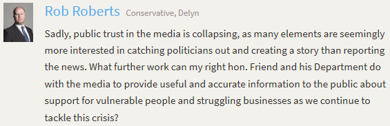 On Monday in the House of Commons two MPs asked Oliver Dowden, the Secretary of State for Digital, Culture, Media and Sport a question regarding Covid19-Disinformation. One of them was Rob Roberts who was one of the Conservative candidates in December who managed to beat the Labour Party and replaced David Hanson, a Labour MPs who had been their MP since 1992. The follow up question from Rob is the image above which thankfully received a reasonably balanced response from Oliver which went: