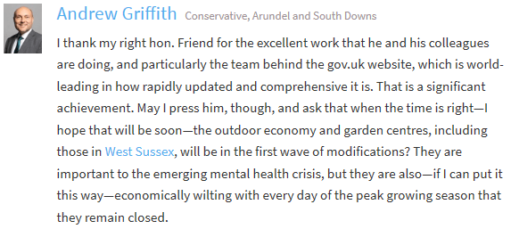 This piece from Andrew Griffith came on Tuesday as part of a debate on the theme of Public Services with Michael Gove acting as the host. There are of course some real benefits for the outdoor economy and garden centres to offer many of us. I have a particular garden centre site that I regularly visit that is in West Sussex, so in one sense I totally agree with Andrew that the quicker Rushfields along with other garden centres are open the better from the point of view of places I would be keen to go to. However garden centres have both outdoor and indoor factors and so in some cases they are no safer than other urban based retail premises. However much more importantly, there are many people across the nation who would not benefit from a garden centre as they are lacking in any outdoor space for their homes and if we are going to have a debate about the improvement of mental health issues in our nation, it would be useful to have a broader approach than simply this one idea. The first aspect of the comment from Andrew however is also one that needs a bit of care. The response from Michael Gove was: