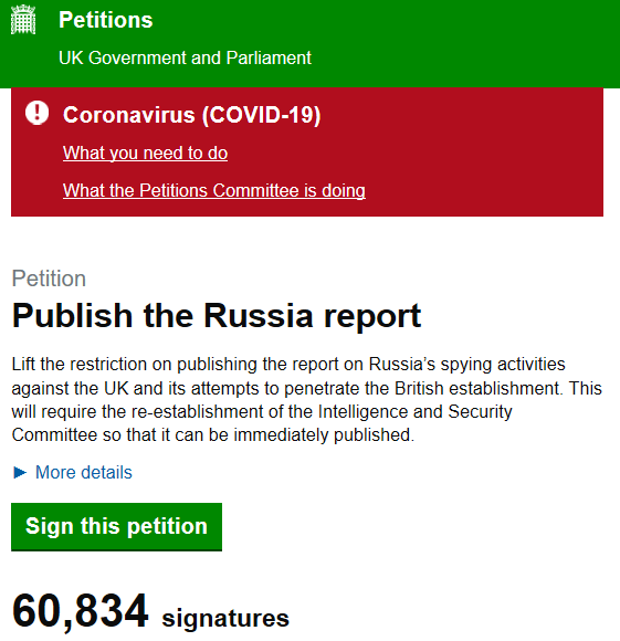 Whatever their decisions about working from home or not, and voting using technology or using the arrangement that Jacob Rees-Mogg has insisted on which goes back several centuries, there is also the requirement for MPs to debate some of the Petitions that have been signed over recent months and that have not yet been debated, even though to date there are 17 that have passed the 100,000 mark. However alongside these 17 petitions this one which on Saturday passed the 60,000 mark and of course this means it is a long way from 100,000 given that it was started in March. However the publication of this report is something that Parliament should do through the Intelligence and Security Committee and given that it could have been published back in November or December and we are now 6 months on from that point, there is surely no reason for it to be delayed. As their website points out: