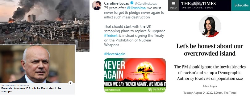 As the work begins in Beirut to deal with the catastrophe caused by the explosion that occurred on Tuesday evening, it is very clear that all nations need to do whatever we can to prevent such things ever happening again. Although it is now clear that there is no connection between it and nuclear explosions, despite the huge impact, nevertheless it is a very timely reminder of the anniversary today of Hiroshima 75 years ago. My MP and her political party are working to use this anniversary as the basis for a campaign to end the replacement of Trident and any other nuclear items and I totally agree with this. As we listen to the stories of Hiroshima and Beirut it is clear we cannot ignore such tragedies. Sadly the Conservative Party which is currently trying to run our nation post the beginning of COVID-19 is also facing a huge number of internal challenges and so the prospect of them focusing on the 75th Anniversary of Hiroshima is very low. They have one ex-Minister who helped to set out the basis for our departure from the EU and voted with his colleagues for the agreement that was settled with the EU, who is now trying to scrap it and have a different deal. Apparently it is ok for him to do this and gain a huge amount of attention, not doubt partly because he appears to have forgotten what he voted for. However those of us who want to remain in the EU and have wanted to do so ever since we were faced with a question are still not able to persuade our nation or Government to find a different way forward. Yet in the last few hours it has emerged how much investors had used Brexit as a way to make Billions of pounds for themselves and in doing so had invested in the same political party that IDS is a member of as well as the Vote Leave campaign. Then one of the Boris Johnson advisers has written a piece in the Times that claims that we are overcrowded as a nation. This is despite the fact that around 11% of our nation is UK is built on and that is with 67m people who live here, although sadly some people are in need of homes so we certainly need to build more homes. However it would be possible to build far more homes and the impact on our nation would be very little and we are certainly not overcrowded as a nation, unlike Lebanon. Indeed they have nearly 3 times as many people for their land mass as we would have. Meanwhile as I wrote on Tuesday another Conservative Minister, Ben Wallace is calling for an expansion to the Trident arrangement so that if there are going to be any explosions as a result of their, they will be far more damaging than the existing Trident prospects. I certainly hope that Caroline Lucas will be listened to at least as much as Iain Duncan Smith, Ben Wallace and Claire Foges as her campaign is a great deal more important than any of the others.