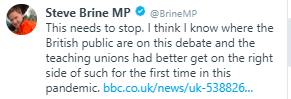 Steve Brine is the Conservative MP for Winchester where he has been their MP since 2010. Prior to that he did spend some time as a journalist so his ability to listen to the public should be relatively competent. His comment yesterday on twitter seems to imply that we all have similar views regarding the return to School in a few days and that he shares those views whereas the teaching unions disagree with us and with him. The article he connected to can be obtained here and it was published on Sunday under the headline “Coronavirus: Schools let down by lack of ‘plan B’, says union”. I won’t repeat the whole article but here are all of the elements that refer to the Union’s comments and requests.