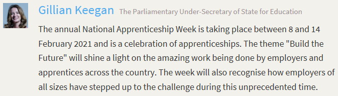 On Tuesday in Parliament Sajid Javid asked a question which is shown below. The response came as the image above shows from Gillian Keegan who is the Minister responsible for Apprenticeships from within the Department of Education. However along with her important role in that Department, Gillian Keegan is also probably the only MP for at least a decade who has been appointed as a Minister who has also worked as an apprentice herself which is much more critical in this context. The challenge is that so often Governments of the day determine people to be their Ministers for a vast number of reasons but their historic and personal experience applied to the department and theme comes down very low on most criteria’s. So we should be applauding this Government for appointing Gillian to this role. However back to the question and answer and then a focus on one way of improving this theme.