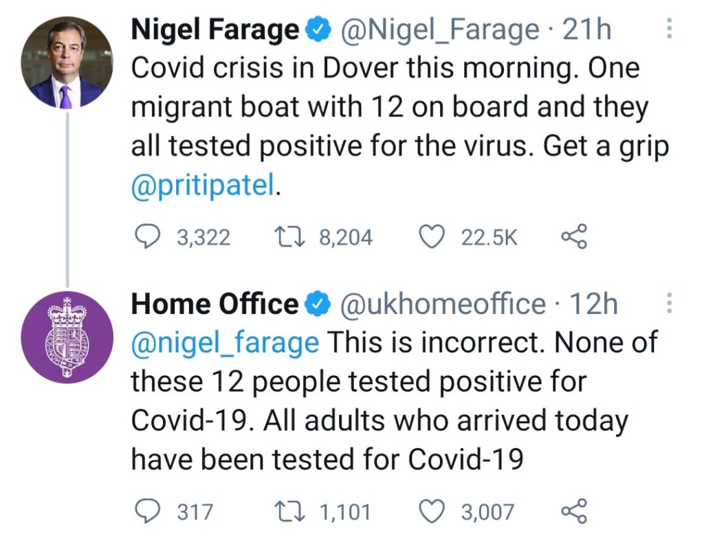 There is clearly a need for those of us who do not agree with Nigel Farage to prevent his lies to be promoted so well. After all, he is claiming that the Asylum seekers which he claims are illegal which is of course untrue are bringing COVID into the UK, yet his claim that up to 40 are arriving a day can be compared to the 15,000 people coming into our nation each day through more usual transportation setting. Yet even if all of the 40 people he claims are coming in to the UK from France were suffering from COVID that represents 0.26% of the numbers who arrive each day and there is a very good chance that our borders are bringing in many more people with COVID than 40 each day, although of course the other 15,000 are coming in through our nations front door.