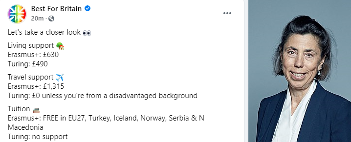 The image on the left of the photo of Baroness Diana Barran came from facebook back 3 days ago on the 13th March and it provides a very clear comparison between the provision of Erasmus and the proposed provision of Turing which is the UK offer to students that as we will see in a few words is supposed to be comparable. I will be honest I have not benefited personally nor have my family from Erasmus so I am not able to confirm the benefits of this. However if our nation is to do a meaningful approach to replace the provision that we had from our 40 years in the EU, Erasmus is one element to refer to. After all we were offered the opportunity to adopt Erasmus by the EU but chose not to during the negotiation and all of the Tory MPs seemed to be willing to accept this. As was expressed back last Wednesday in the Prime Ministers Questions in response to a question from the SNP Deputy Leader Kirsten Oswald who is the MP for East Renfrewshire