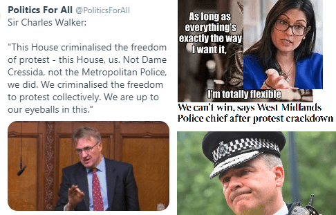 Over the last two days this week there has been the first and second reading of a political Bill that is clearly not fit for purpose and even if it included issues that were appropriate it was clearly something that is not well timed. The “Police, Crime, Sentencing and Courts Bill” includes issues related to the protests and that is what many people including Sir Charles Walker who is the Conservative MP for Broxbourne are deeply concerned about. His view is expressed very clearly on that tweet from Politics for All but he stated it very clearly in Parliament on Monday and there was a response from Priti Patel