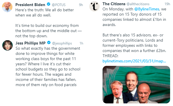 These three tweets emerged this morning, although in the case of the citizens piece it was a retweet that emerged from yesterday during the day. However the two on the left are both very important in finding ways to improve our nation and although Joe Biden is of course focusing on his nation the proposal in his tweet is vital for all nations. The one on the right on the other hand is deeply disturbing. It is not new information but it uses a few words to show that the current Conservative approach to supporting their donors and their senior party members is very different to the claim from Joe Biden as to how we should improve economies. The call by Jess Phillips is another challenge that requires a very clear improvement to all communities whether they are in the South or the North and if they are in the East or the West. Indeed although Jess Phillips is calling for support for white working class families, indeed what is needed in our economy is for new ways of reducing the extreme richness to grow as it has over the last 10 years and for people on lower incomes to be able to have more provision from the whole of society. In the same way as Joe Biden has written his few words. We need to find some people who are willing to take the call from Joe and Jess and very seriously challenge the behaviour of Boris and his colleagues who are facilitating these corrupt actions.