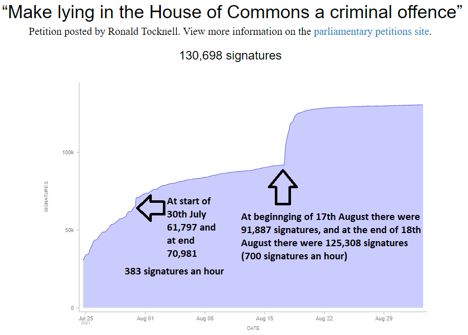 A couple of weeks ago on the 14th August I spotted an e-petition which had nearly reached 90,000 signatures and so I wrote about it here on my blog. The petition is vital as it refers to the call for “Make lying in the House of Commons a criminal offence” At the point I wrote the blog it had 89,400 signatures. This image is produced for all of these petitions once they achieve 20k-30k signatures so it is impossible to know how quickly the petitions grow up from the first 5 signatures to the first 20k-30k. What we do know is that the petition was produced on the 14th April and as we can see here on this website the image first emerged on 24th July with 30,636 signatures so it had taken over 3 months to get to 30,000. Today on 2nd September the total is 130,698 and the numbers continue to rise during the day. As we can see there are two very strong increases since the 24th July and there could be a number of others. The real point is that these petitions can increase in their size and what is unclear is what the cause of these growths are. How fascinating it is as well as the vital aspect of the petitions.