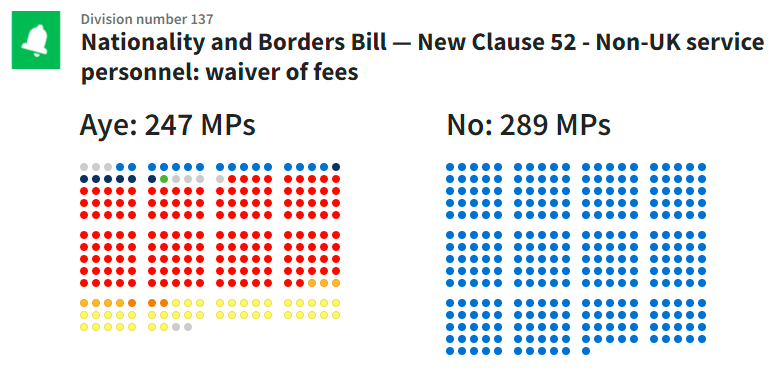 - New Clause 52 – Non-UK service personnel: waiver of fees 247 for, 289 against.