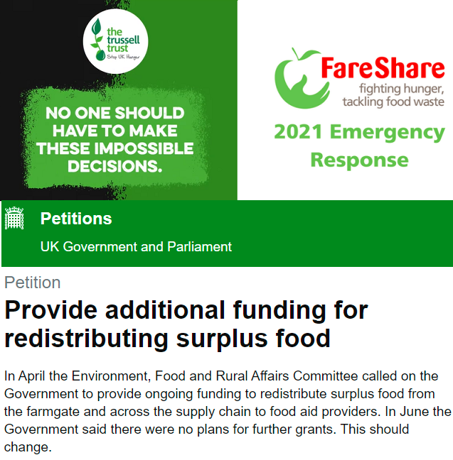 I have had the privilege of working with both FareShare and Foodbank schemes and I was intrigued to see back in June that the call by the EFRA Committee in Parliament which in early April had called for the Government to fund charities like FareShare for redistributing surplus food across the UK. Tragically as the Petition explains, the Government decided not to provide the funds and the reality is that unless the funding is provided, tonnes of surplus food that could be eaten will be destroyed every year as has been the case in the past. The Petition is due to end on 29th December and so far we have only achieved 3,400 signatures. If we could get it to 10,000 by the 29th December the Government would need to respond. If we could get it to 100,000 by the 29th December then in the New Year Parliament could potentially debate it. Please consider signing this petition here while assisting the FareShare and The Trussell Trust charities or sending funds to the local foodbanks in your area.