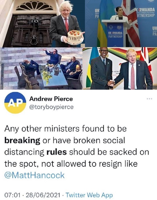 In regard to the COVID issue back in mid 2021 Andrew Pierce wrote his twitter comment before he and many other people realised that Boris Johnson had broken and was still breaking social distance rules in the same way that Matt Hancock had done so. The call from Pierce that