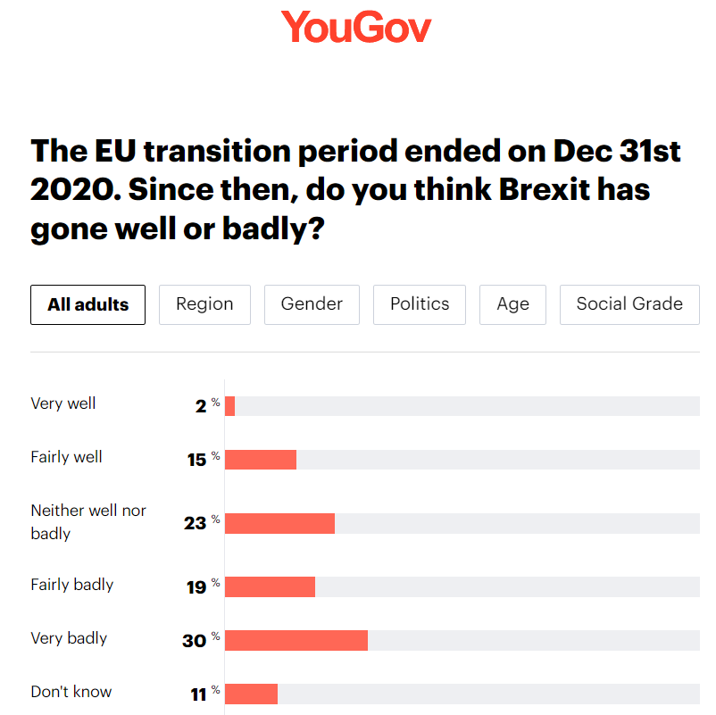We want the Government to start the process of seeking to rejoin the EU. Only 2% of the public think that Brexit has gone ‘very well’ and only 15% ‘fairly well’ since the end of the transition period*.
