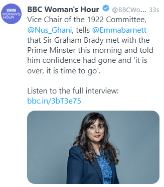 Yesterday Nusrat Ghani who is the MP for Wealden asked this question in part of the Business of the House session. It is interesting because although I have not spotted a response from Nusrat criticising the Prime Minister so far but as her twitter makes clear, she is the Vice Chair of the 1922 Committee so perhaps she has to be more careful although I know that other 1922 Committee people have been far clearer in the past. Anyway here is her question yesterday and the rather inadequate response from Mark Spencer.