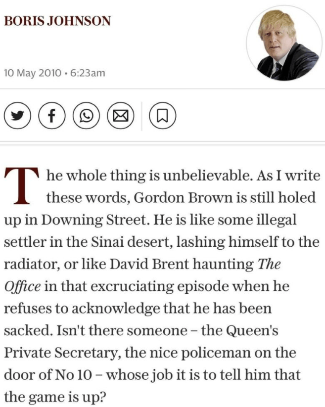 My friend Kent Reynolds kindly spotted this piece early yesterday and indeed the Daily Express has also posted it. Given how supportive of the Conservative Party the Express is it demonstrates that Johnson is not acting very positively. This piece was from Boris in his Telegraph column that was his wealthy source for many years that in itself is very disturbing given he was a politician and they were paying him about £250k each year for one column a week. One of the challenges that we all are aware if is that he wrote a column about leaving the EU, one of which was saying we should not do so because of the damage that it would create for our nation and the other which in the end he posted that claiming that leaving the EU would be good for our nation. It would be interesting to know if he might have written an alternative piece about the action from Gordon Brown back in 2010. What is clear is that Gordon only remained in No 10 for a few days while the Conservative and Liberal Democrat Party were working out what they would do about managing the UK. So if Johnson was angry about Brown being in No 10 for a few days, he should fully appreciate how angry many of us feel about him remaining as Prime Minister for several months and controlling the Government which Gordon Brown certainly did not do.