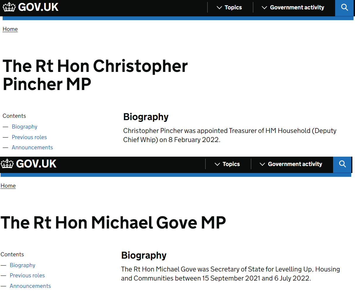 These two images were picked up this morning from the Government website which can be seen here under the headline of All ministers and senior officials on GOV.UK. The first one which is here lists the various aspects that Rt Hon Christopher Pincher MP has done in the past and it makes it clear that he was appointed as the Deputy Chief Whip of the Party on the 8th February 2022 and there is no indication that his role has ended. This is despite the fact that we have been informed in the news that he resigned on the 30th of June because of his getting drunk. Since that experience there has also been his “groping claims”. This action and the personal knowledge of his behaviour led Boris Johnson to resign on the 6th of July although of course Boris Johnson is still our Prime Minister, even though many of us would want him to have been replaced immediately. The other page relates to Rt Hon Michael Gove MP who was the Secretary for Levelling Up from the 15th September 2021 until the 6th July when he challenged Boris Johnson and he was sacked by Boris Johnson and removed from that role immediately. His role is now being dealt by Neil O’Brien who became the MP for Harborough in 2017. He was the Under Secretary of Levelling Up since 19th of September 2021 and he is now in charge of the Department.