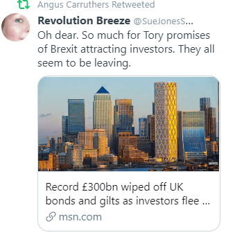 A couple of days ago Revolution Breeze – Sue Jones (@SueJonesSays) who is the “Public interest issues, policy, human rights & social sciences. Researcher & writer for: Politics & Insights (home site), & others Social Affairs Editor: Scisco politicsandinsights.org“ put out this twitter and it provided a link to this article which was titled with “Record £300bn wiped off UK bonds and gilts as investors flee in biggest market collapse in decades” and the article written by Michiel Willems which is available here begins with these first few words