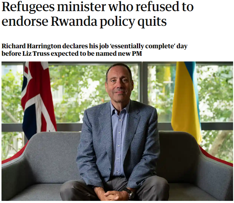 Back in June Lord Harrington of Watford stated “I can assure the noble Lord that there are two very good legal channels for refugees from Ukraine to come to this country. There is therefore no reason at all for them to be sent to Rwanda or anywhere else other than, I hope, back to Ukraine when the political and military situation allows.” and he stated this on the same day “I reiterate that refugees from Ukraine are perfectly welcome to come here and there is absolutely no reason why they should be sent to Rwanda. They are welcome here, we have accommodation for them, local authorities are paid to look after them and we have already welcomed nearly 70,000.” and it appears that he has now left the Government as Guardian states here this afternoon in a document written by Matthew Weaver that can be obtained from here.