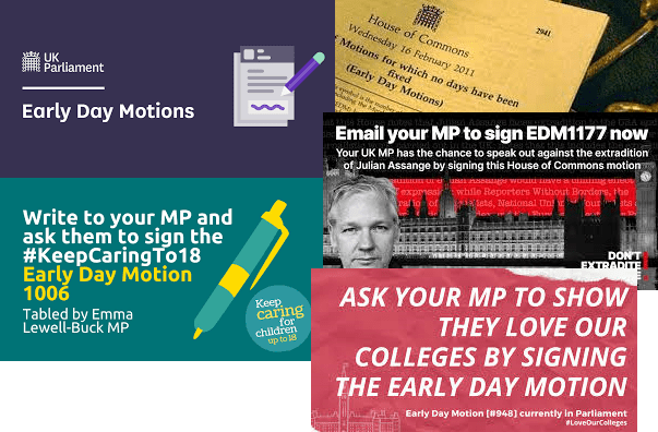 Early Day Motions (EDMs) are motions that formally call for debate in the House of Commons on a day which has not been fixed. This means that few, if any, are debated. Along with many colleagues on both sides of the House I do not sign EDMs. I realise that some people are disappointed when they learn that I will not sign an EDM and so I explain here why I will not do so. They are hugely expensive to administer, described as “highly narcissistic” and they are often not written by the MPs who table them. They serve no useful purpose.