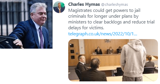 Last night Charles Hymas who is the Home Affairs Editor for the Telegraph published an article, which can be obtained from here and the first part of which is listed below. The comment begins with the phrase “Magistrates could jail criminals for twice as long in justice shake-up” and towards the end of the element I have included is the comment that “Earlier this year, their sentencing powers were also doubled from six to 12 months. The proposal from Brandon Lewis is that having increased their situation from half a year which has been in their position for many years to one year that he now wants to extend it to two years so in effect he is extending their action by four times in less than one year. Now of course if the Magistrates wanted to significantly increase their influence, to extend their role by four times would potentially be acceptable. However there is a very clear indication that many of them were not calling for it to be extended and to do so twice in one year without a meaningful contact is very concerning. After all if Parliament called for MPs to change their roles twice in one year would be very disturbing. I was previously the Chair of the Surrey and Sussex Courts Board when the previous Government called for community members to participate and one of the people I worked with for several years was Jon Collins. Jon is now the Chief Executive of the Prisoners Education Trust and he has commented on twitter