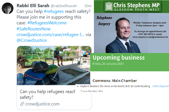 so when I spotted her tweet item I had a look at the Parliament and I came across that back in June 2021 the first reading of the Chris Stephens MP Housing Standards (Refugees and Asylum Seekers) Bill took place and that back in June 2022 the Bill was scheduled to be read for the second time. However tragically it did not take place and so currently his Bill is currently planned to be read for the second time in 20th January 2023. However there are a significant number of second private Bills so we are not sure if it will take place in January. Let us hope that will occur.