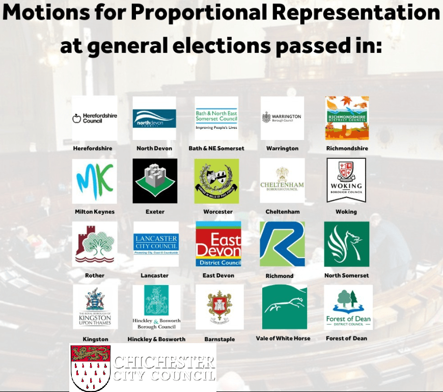 Back in September I wrote a few blogs about Proportional Representation because of the focus that was emerging within the Labour Party. Indeed this blog was focused on an Early Day Motion that Chuka Umunna had set out in 2016 while he was the Labour MP for Streatham. Sadly when Chuka shifted in February 2019 to Change UK and then to Liberal Democratic in June 2019 he was not able to remain as their local MP in December 2019 at the General Election. When he wrote his EDM there was a total of 69 other MPs who endorsed his call but given that there have been two General Elections since that document there are now only 41 MPs who signed who are still within Parliament. I have listed the active MPs below and also the text from Chuka’s EDM. The reason I have revisited that detail is because yesterday I wrote another blog about Proportional Representation because initially I had seen that Chichester City Council had endorsed Proportional Representation for future General Elections. As I subsequently read other details I then spotted that the Councils for Proportional Representation that had promoted the Chichester City Council had a list of 20 other Councils that are all in favour of Proportional Representation. I added them to yesterdays blog visually and here is that image with Chichester attached that I pasted on today. The Councils that are in favour of Proportional Representation are also listed below: