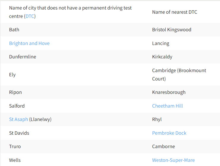 Based on customer demand, 60 cities, out of 70, have permanent driving test centres. The ten that do not are listed below, alongside their nearest test centre. The only cities without a driving test centre within 15 miles are Wells and St Davids.