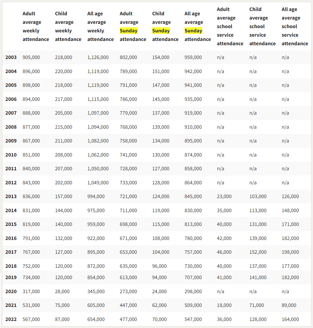 The National Church Institutions first started collecting attendance data centrally in the autumn of 2000; as a result, it is not possible to publish data for the period 1994-1999. A methodological change also took place between 2000 and 2003 which means statistics for those years are not directly comparable with the data now collected. The data displayed below shows the longest period of comparable figures available, from 2003-2022.